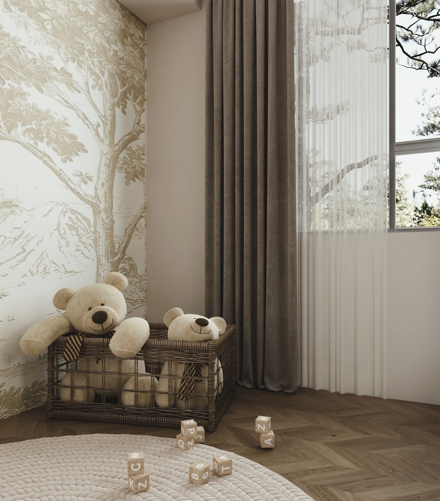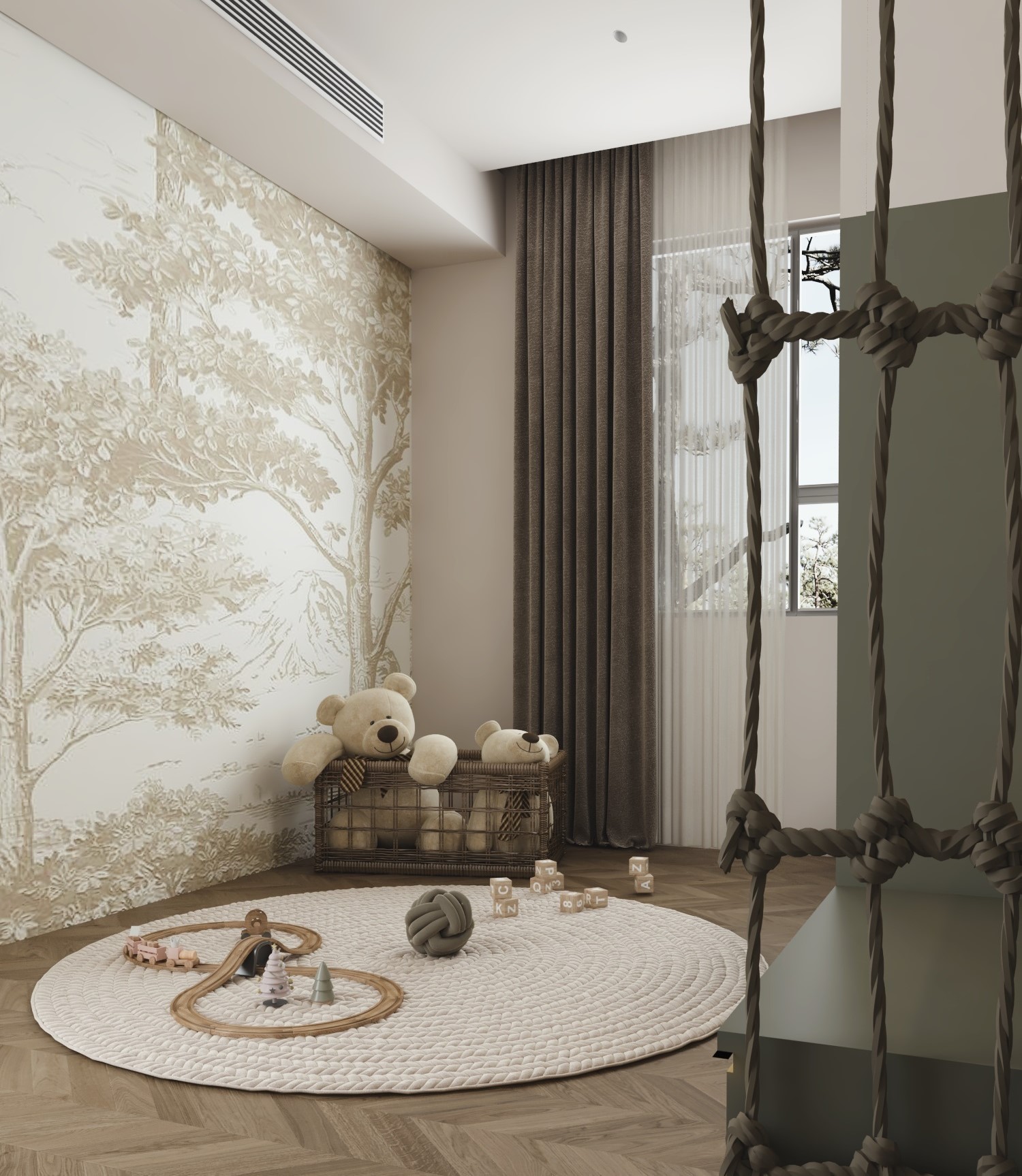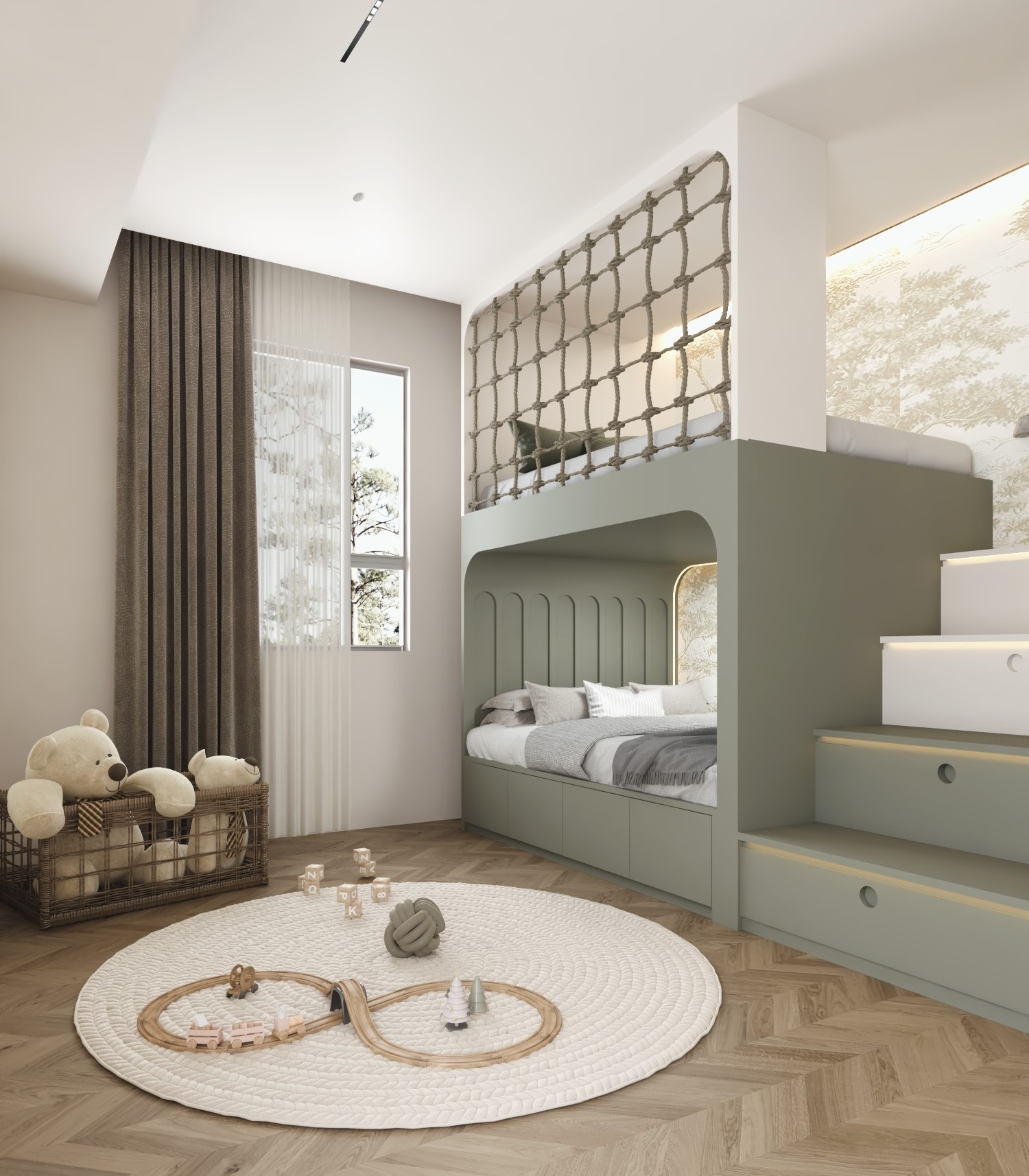 A modern kids' room featuring a space-saving bunk bed, soft tones, playful decor, and a cozy forest-themed vibe.